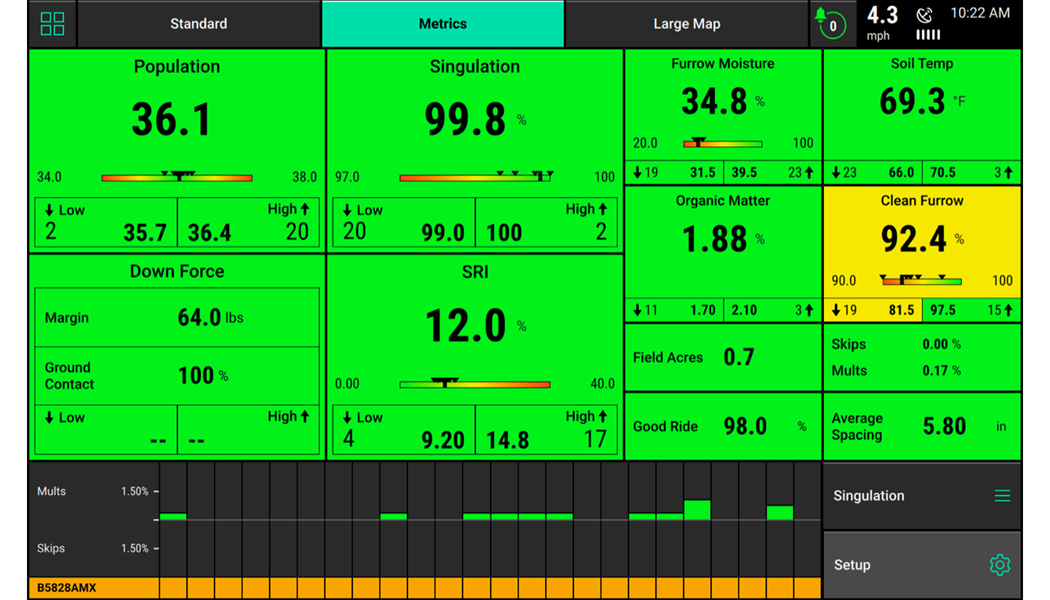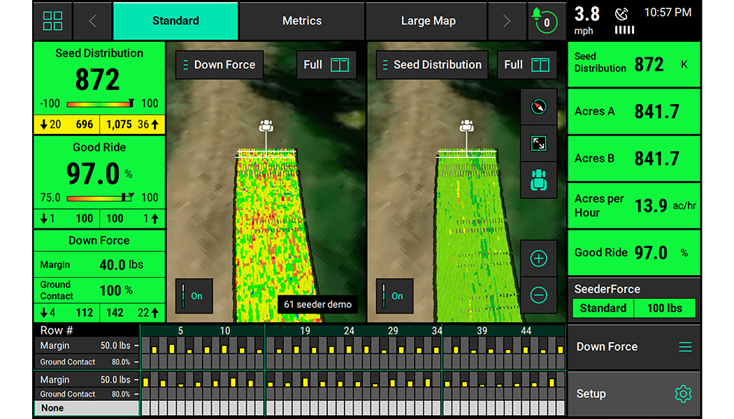 Visibility into the performance of your air seeder has always been a challenge. High application rates, very small product sizes, and product blending combine to make monitoring difficult, especially with current blockage sensor technology. Your 20|20 features metrics that bring visibility and understanding to the performance of your air seeder or drill, giving you row by row comparison to quickly identify inconsistencies.