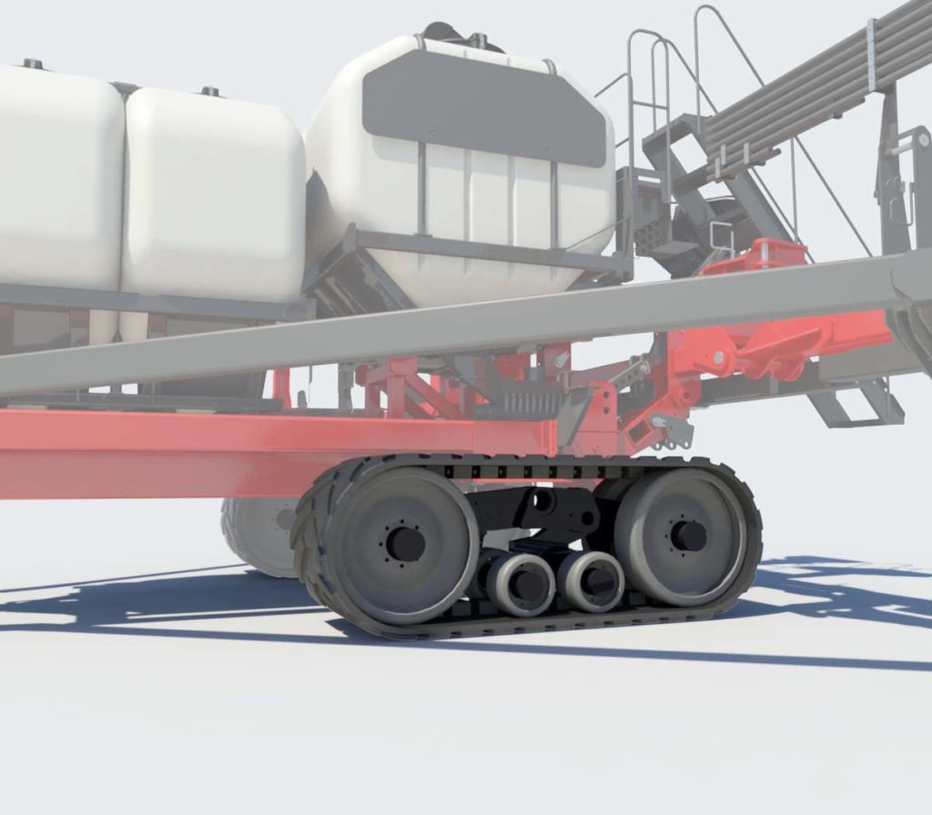 The rubber track system on the 10K Planter Bar gets you in the field earlier to extend the growing season. The track system distributes the weight of the two 750-gallon liquid tanks over a larger footprint utilizing flotation to guard against compaction that can come from toolbars using traditional tires.